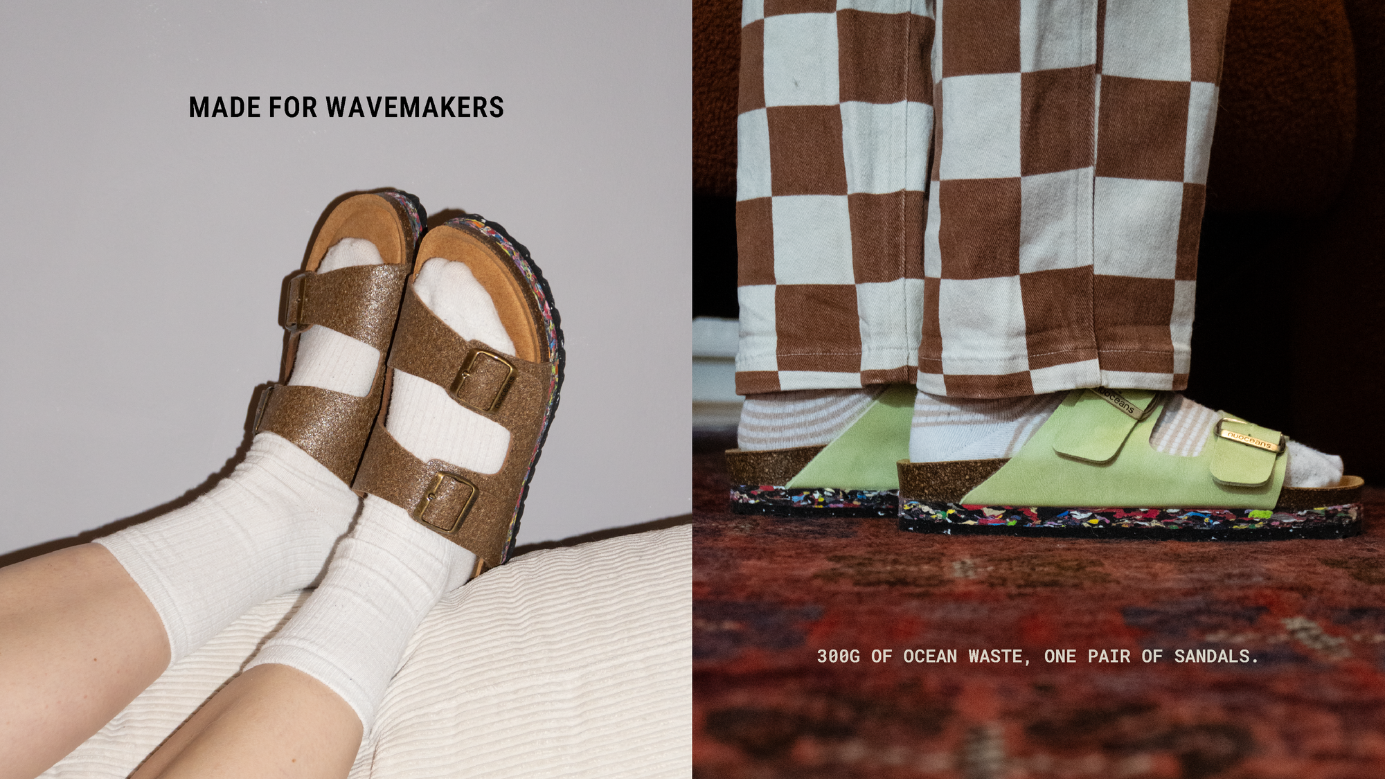 300g of ocean waste saved with every pair. Made from recycled cork, EVA, and PVC, and fully recyclable to keep the cycle going.