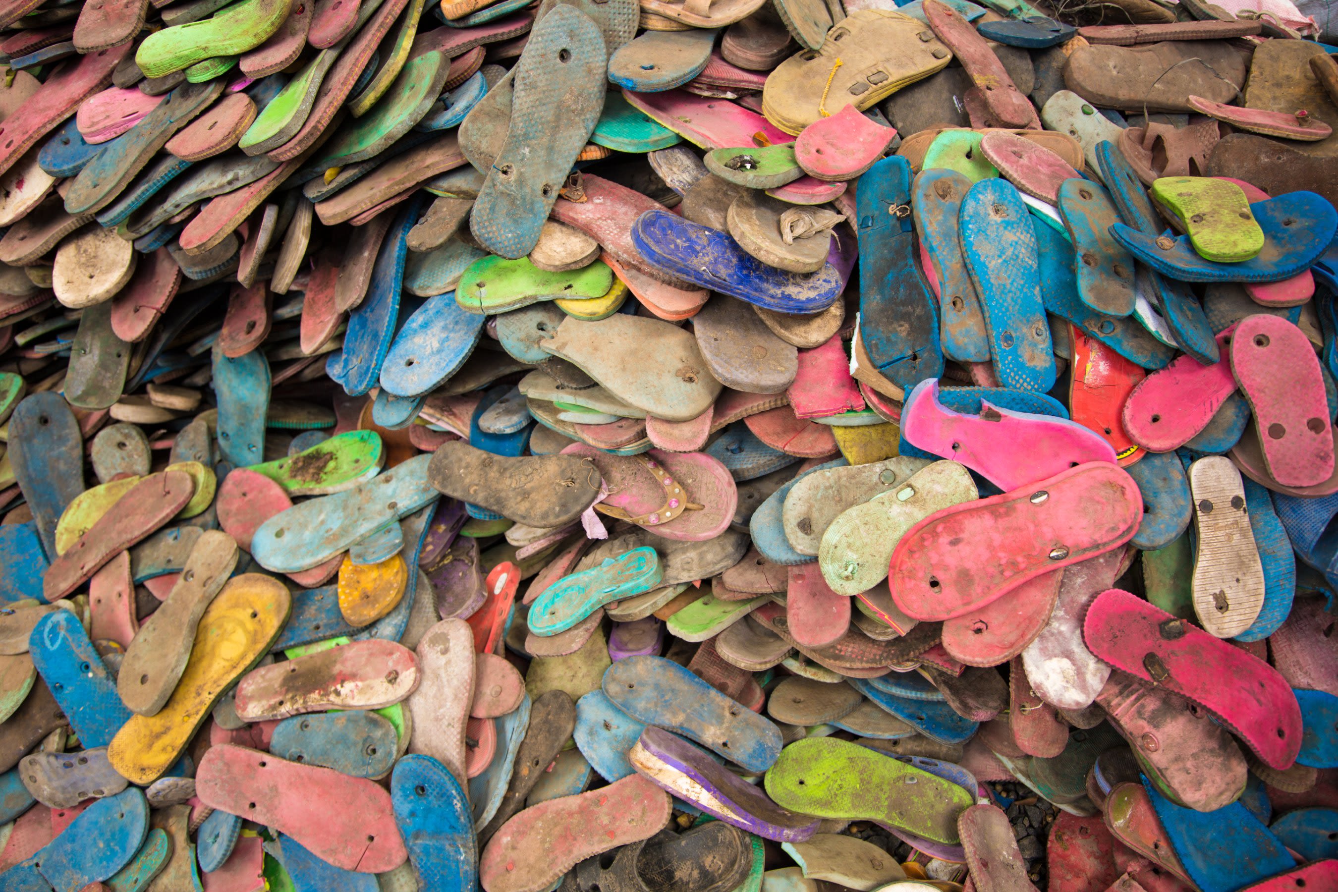 Jedes Jahr tun wir uns mit Trash Hero zusammen, um tausende Flip-Flops von den Stränden Südostasiens zu retten. Wir sortieren sie nach Farben und verpassen ihnen eine gründliche Reinigung. Diese Vorbereitung ist der erste Schritt, um die aussortierten Sandalen in die lebhaften Materialien für unsere einzigartigen Kreationen zu verwandeln.