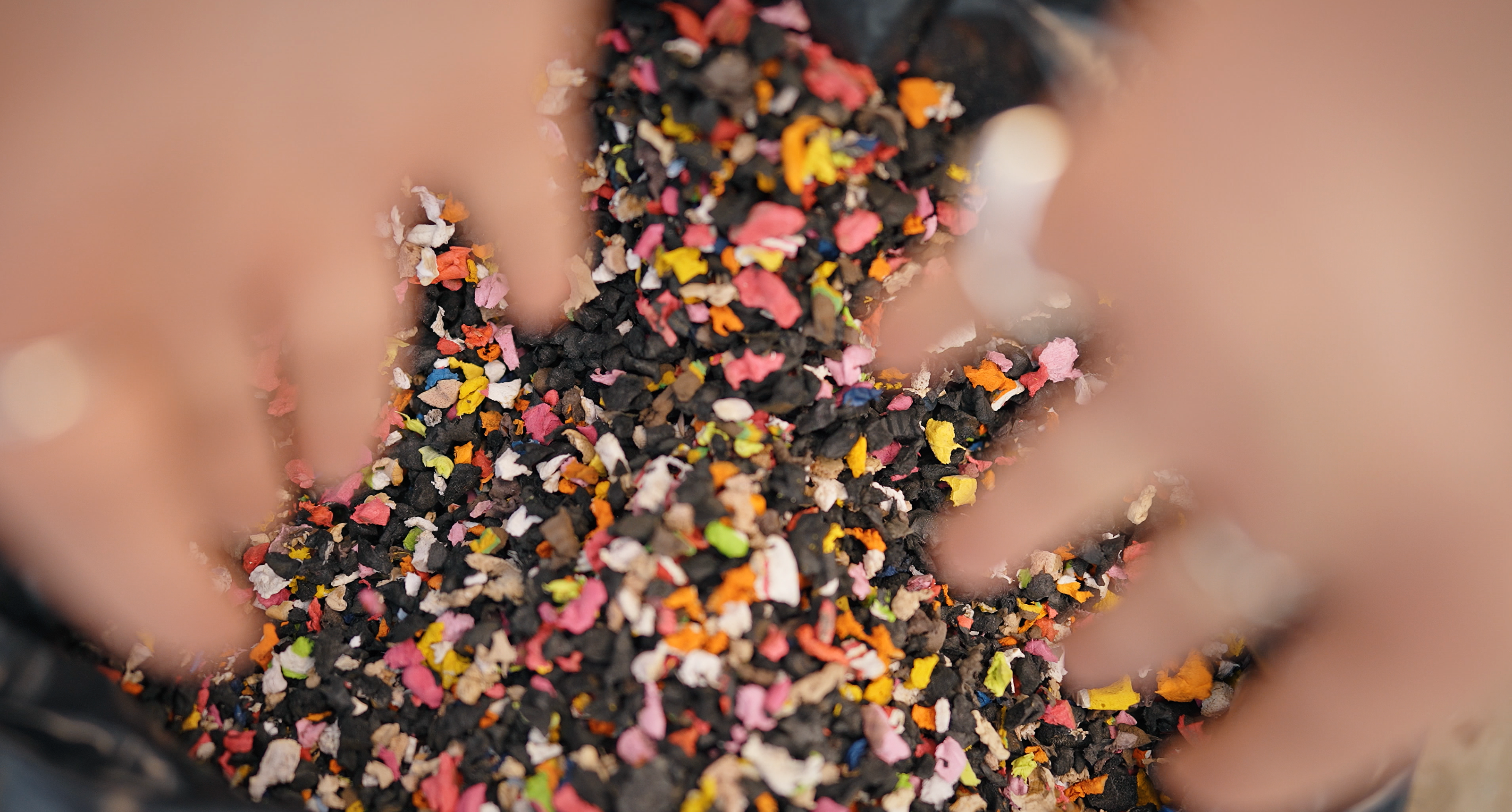 Mit unseren Spezialmaschinen werden die Flip-Flops in winzige Stücke geschreddert – das bunte Konfetti, das die Basis für unsere Nuo-Sohlen bildet. Diese werden dann nochmal gereinigt, bevor sie hitzegepresst in die finalen Schichten verwandelt werden.
