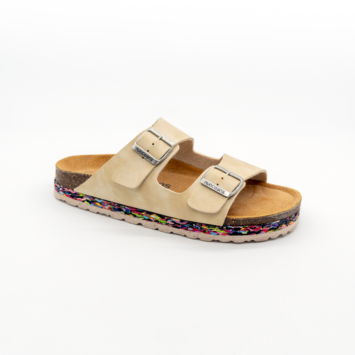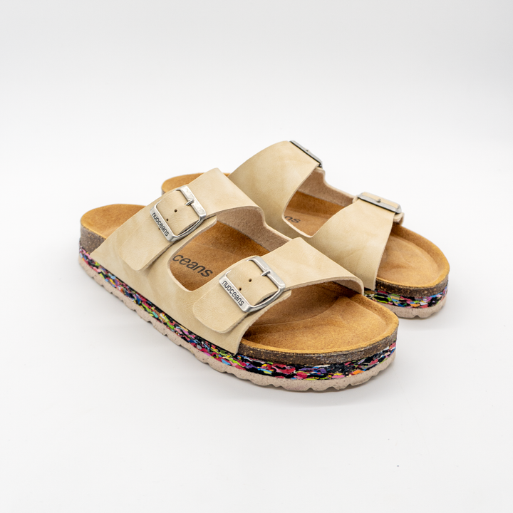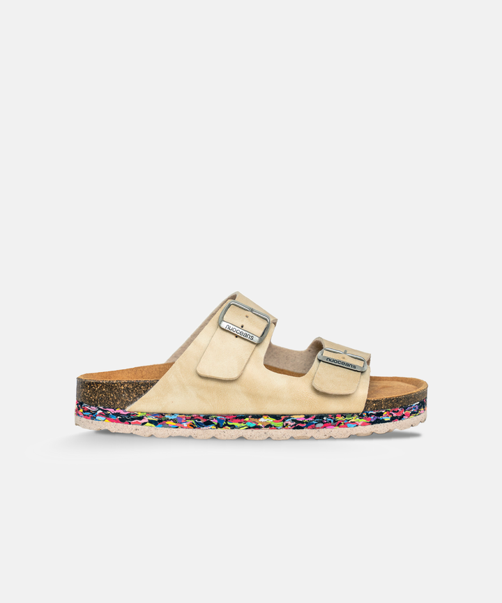 Sa semelle intermédiaire iconique et colorée, fabriquée à partir de tongs récupérées dans les océans, est devenue la signature de celles et ceux qui font partie de l’univers nuoceans.