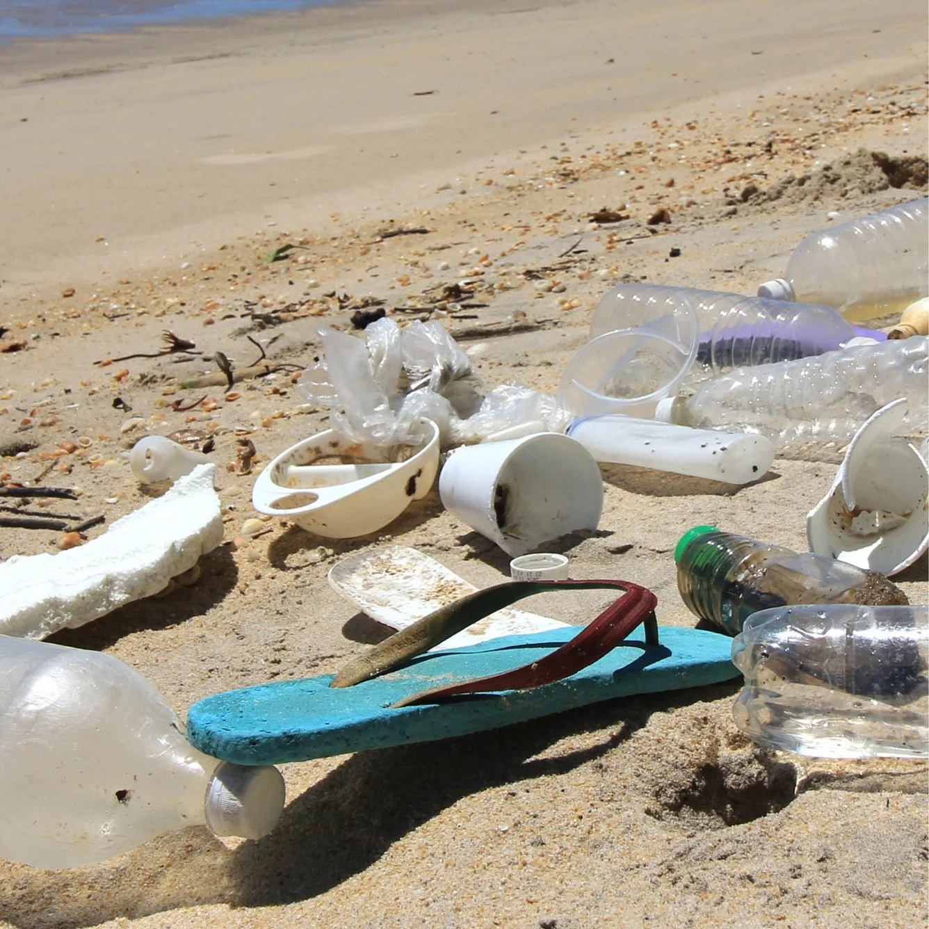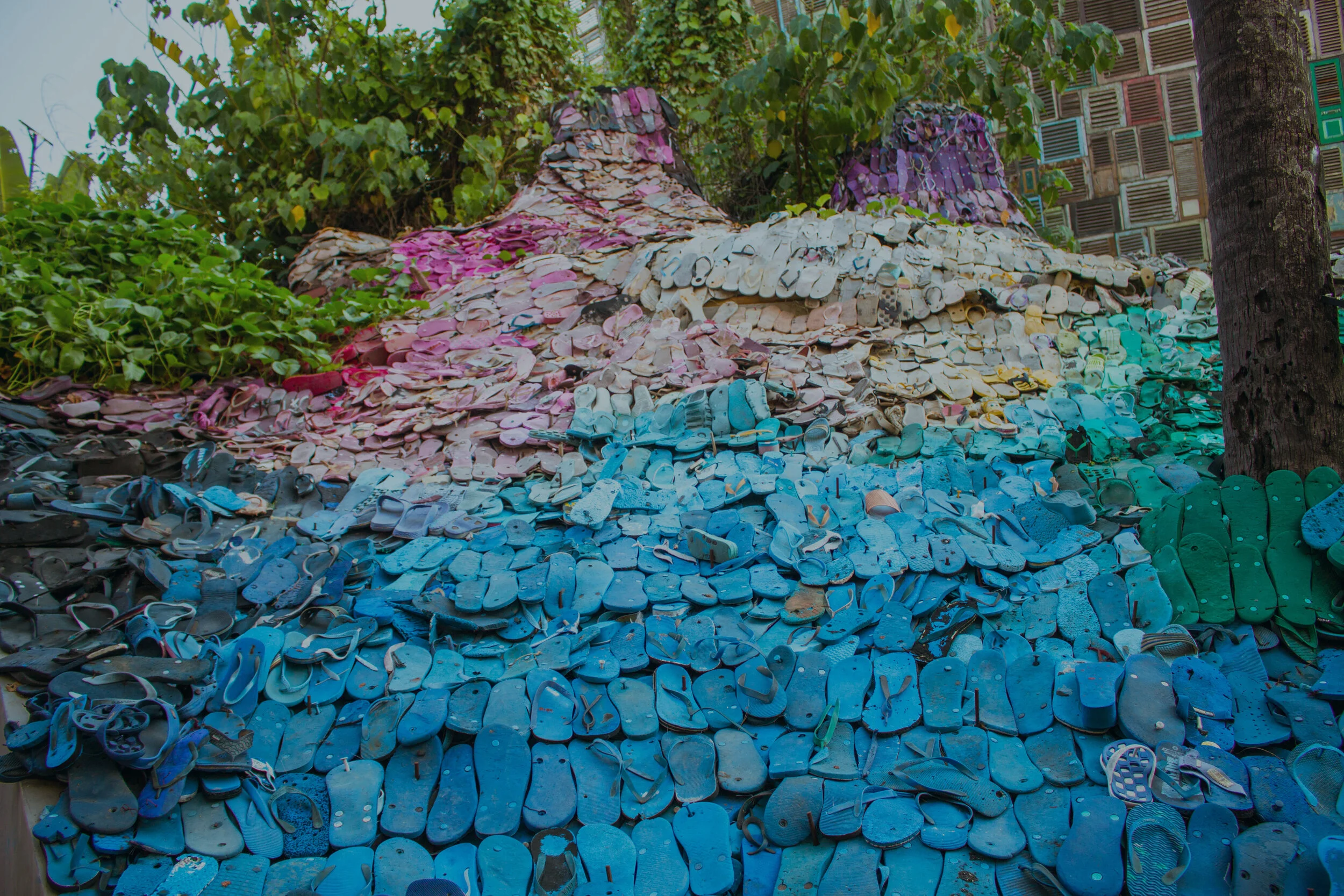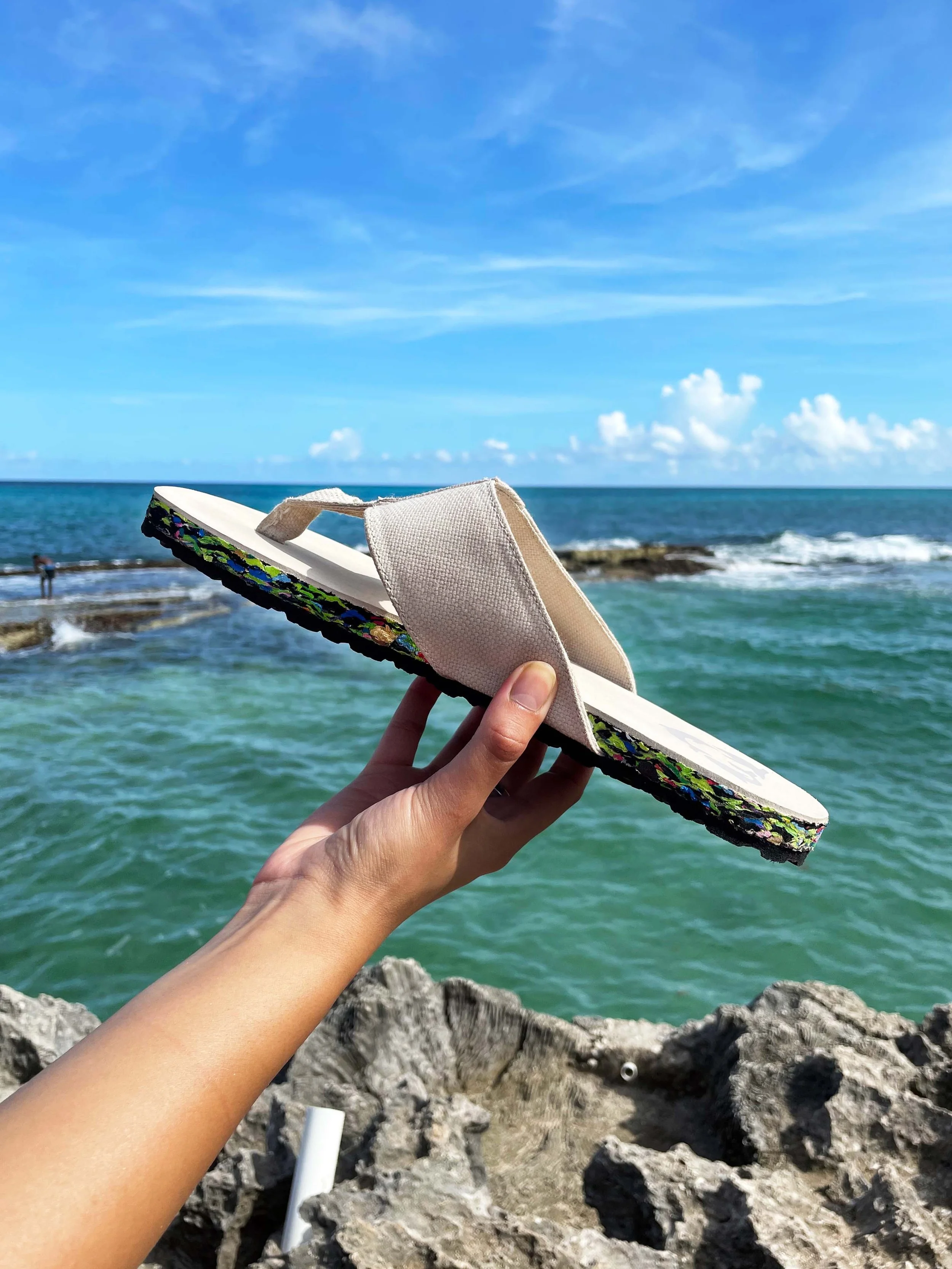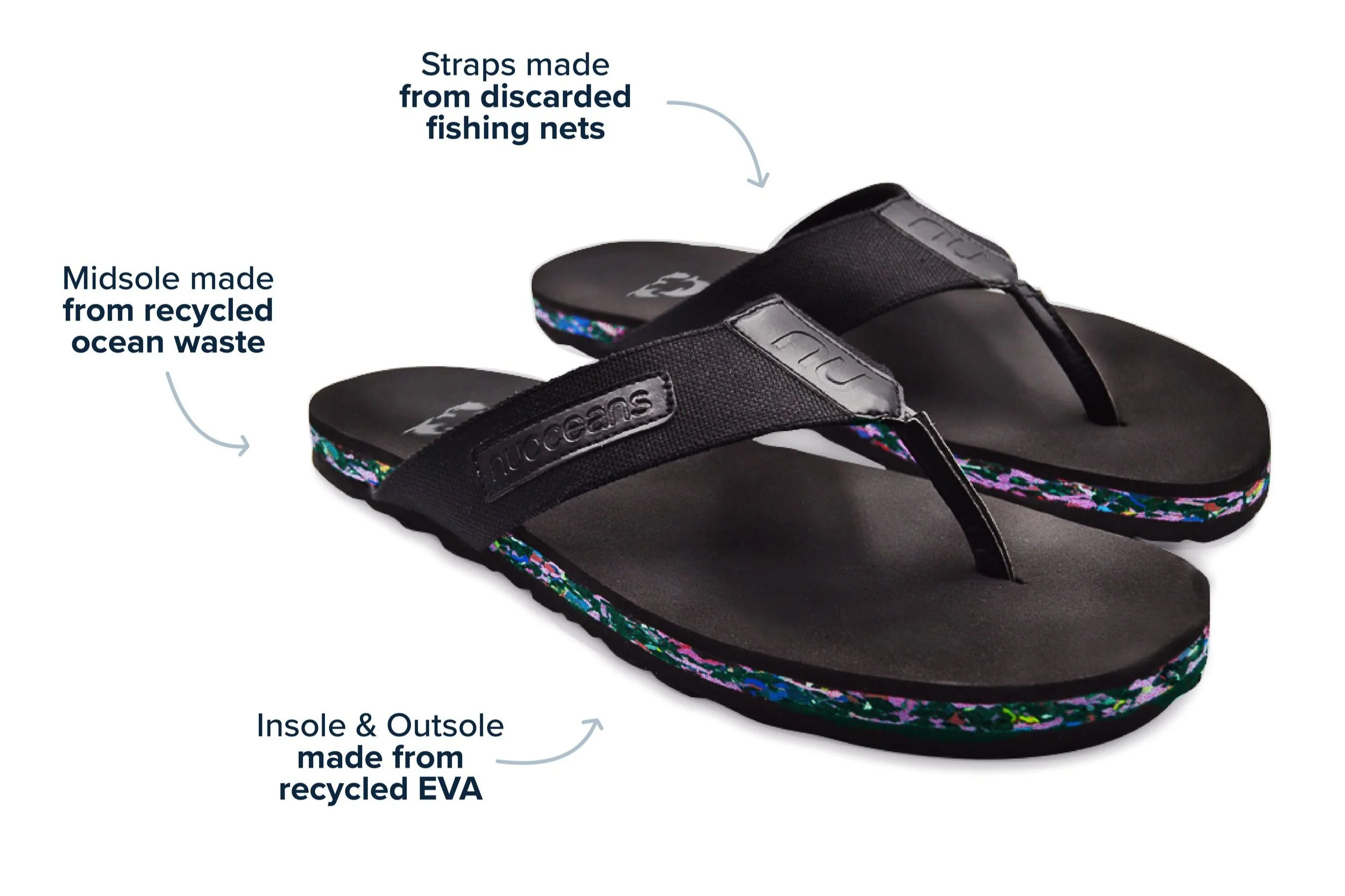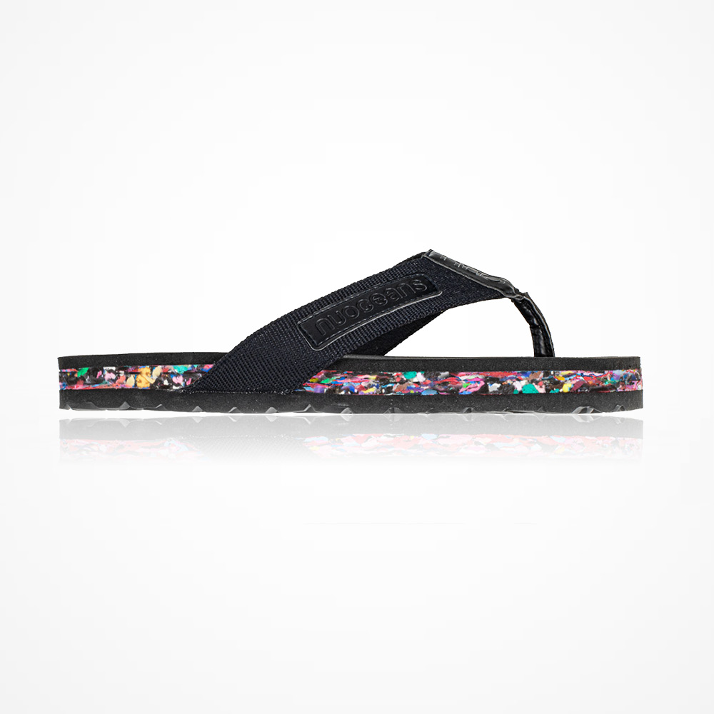 The colourful middle layer of our models is made from discarded flip-flops collected from rubbish-strewn coastlines - these are cleaned, shredded, and pressed to create the special and oh so comfortable Nuo soles.