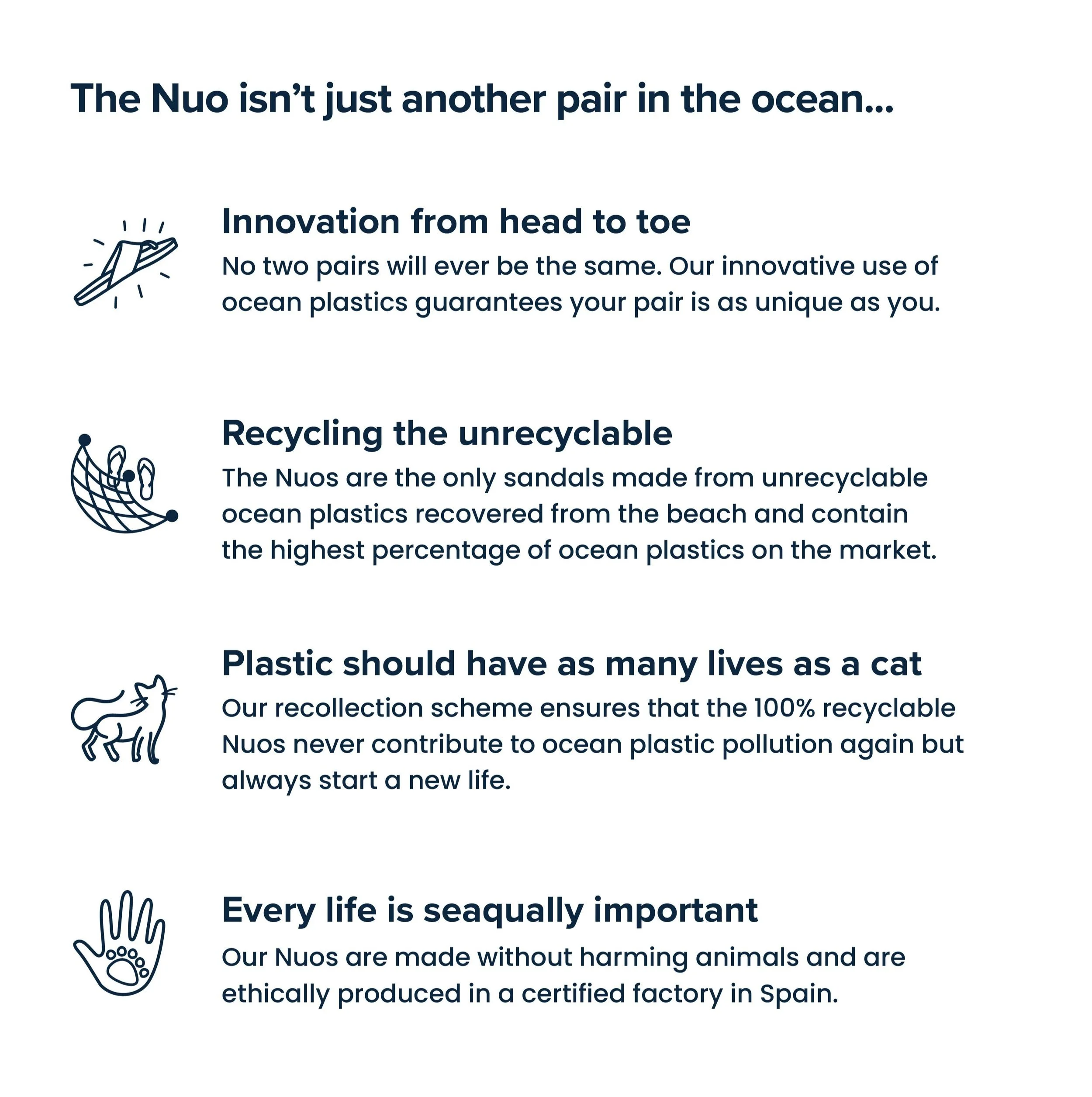 Our circular manufacturing process means that you can return your worn-out pair of Nuos and we’ll give them a new life. This process ensures that our sandals never pollute our oceans or lands again.